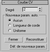 Les boutons radio de ce groupe permettent de choisir un reparamétrage automatique. Elles sont similaires aux commandes de la boîte de dialogue Définir de nouveaux paramètres, avec une caractéristique supplémentaire : toutes les choix d'options (sauf Aucun) indiquent à 3ds Max d'effectuer de nouveau le paramétrage automatique de la courbe à chaque modification (déplacement de CV, affinement, etc.).