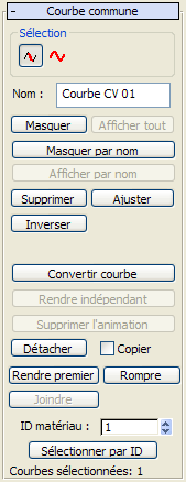 Cette section décrit les commandes communes aux courbes de points et aux courbes CV. Un panneau déroulant intitulé Courbe commune contient les commandes des sous-objets courbe pour les modèles NURBS.