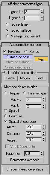 Les commandes de ce panneau déroulant sont identiques aux commandes d'approximation de surface des objets surface NURBS, avec deux boutons supplémentaires : Jeu sélectionné et Réinitialiser.