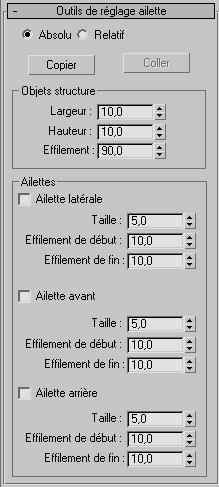 Utilisez les cases à cocher pour activer ou désactiver les ailettes sur les côtés de la structure et les paramètres numériques permettant de contrôler la taille des ailettes et les paramètres de la dépouille.