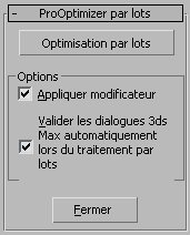 Le panneau déroulant ProOptimizer par lots contient quelques options et permet d'accéder à la boîte de dialogue Optimisation par lots, qui comporte les commandes principales de l'utilitaire.