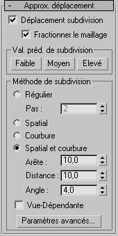 Les commandes de ces deux zones indiquent comment le modificateur applique la texture de déplacement lorsque les options Paramètres personnalisés et Déplacement subdivision sont toutes deux activées. Elles sont identiques aux commandes Approximation de surface utilisées pour les surfaces NURBS.