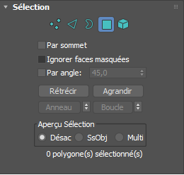 La partie inférieure du panneau déroulant Sélection affiche des informations sur la sélection courante. Si plus d'un sous-objet est sélectionné, le texte indique le nombre et le type sélectionnés; par exemple "4 polygones sélectionnés". Si un sous-objet est sélectionné, le texte indique le numéro d'identification et le type de l'élément sélectionné; par exemple " polygone 73 sélectionné ".