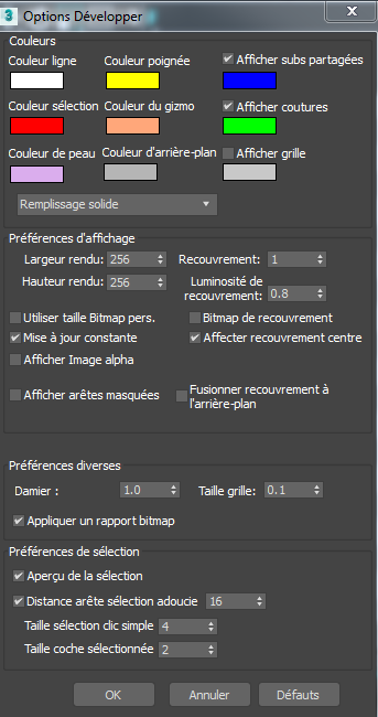 Définissez les préférences de l'éditeur du modificateur Dével. UVW à l'aide des commandes de la boîte de dialogue Options Développer.