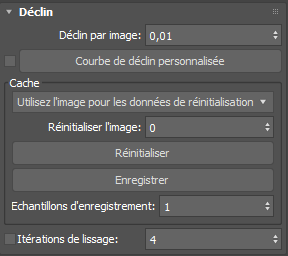 - Définit la valeur de déclin par image. Plus cette valeur est élevée, plus le déclin est rapide. Une valeur nulle indique l'absence de déclin.
