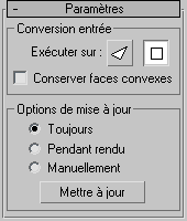 Cette zone permet de définir des options de mise à jour manuelles ou de rendu pour les situations où la complexité de l'objet lissé est trop élevée pour une mise à jour automatique. Vous remarquerez en outre qu'il est possible, sur le panneau déroulant Quantité subdivision, de définir une grande quantité de lissage à appliquer uniquement lors du rendu.