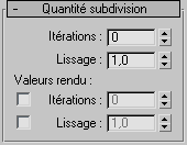 La valeur par défaut (0 itération) permet de modifier tout paramètre ou réglage, tel que le type de lissage de maillage ou les options de mise à jour, avant que 3ds Max ne démarre la subdivision du maillage.