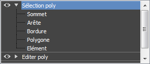 Le modificateur Sélection poly permet de transmettre la sélection sous-objet aux modificateurs placés plus haut dans la pile. Il fournit une panoplie enrichie de fonctions de sélection disponibles dans Poly éditable. Vous pouvez sélectionner des sommets, des arêtes, des bordures, des polygones et des éléments. Vous pouvez également changer la sélection pour passer du niveau de sous-objet au niveau de l'objet.