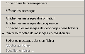 Efface les messages dans la fenêtre. Cette option équivaut à cliquer sur le bouton Effacer dans la fenêtre principale.