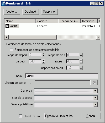 - Si les tâches de rendu en différé et l'ensemble des paramètres définis dans la boîte de dialogue Rendu en différé sont exportés dans un fichier BAT pour effectuer ultérieurement un rendu à partir de la ligne de commande.