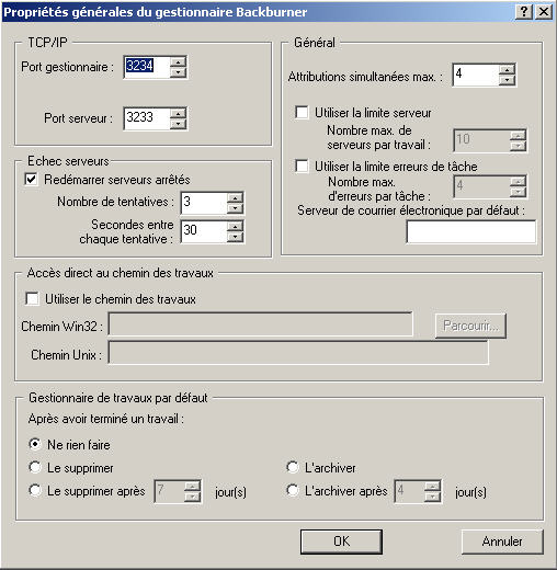 Lorsque vous lancez le Gestionnaire pour la première fois, la boîte de dialogue Propriétés générales du gestionnaire Backburner s'affiche, comme dans l'illustration ci-dessous: