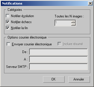Cette boîte de dialogue permet à une tâche de rendu en réseau d'envoyer des notifications par courrier électronique. Ces notifications sont particulièrement utiles lors de rendus laborieux et longs, comme un rendu d'animation, car il n'est alors plus nécessaire de demeurer à proximité du système durant l'opération.