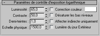 Après avoir analysé la scène pour savoir s'il s'agit d'une scène extérieure exposée à la lumière du jour et connaître le niveau de luminosité et de contraste, le contrôle d'exposition logarithmique associe des valeurs physiques à des valeurs RVB. Vous pouvez l'utiliser avec deux types de rendu, le rendu lignes de balayage par défaut ou le rendu mental ray. Ce type de contrôle d'exposition est davantage adapté aux scènes dotées d'une plage dynamique extrêmement élevée.