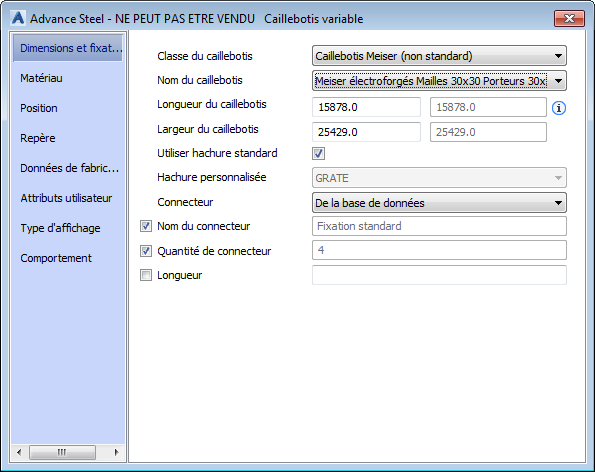 | Dimension du caillebotis | Affiche la liste des tailles de caillebotis conformément à la sélection (fournisseur) de la classe. |