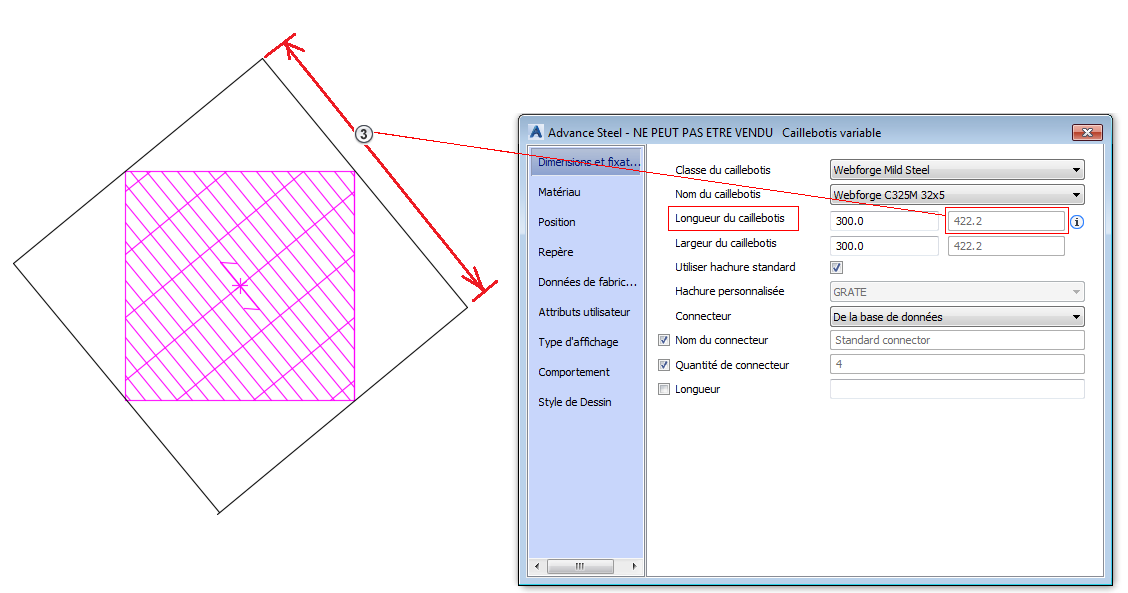 Remarque : Dans la boîte de dialogue Caillebotis variable, si vous passez le pointeur de la souris sur le point d'exclamation sur le côté droit du champ grisé Longueur du caillebotis, une info-bulle s'affiche. L'info-bulle fournit des explications sur l'existence de deux champs Longueur/Largeur.