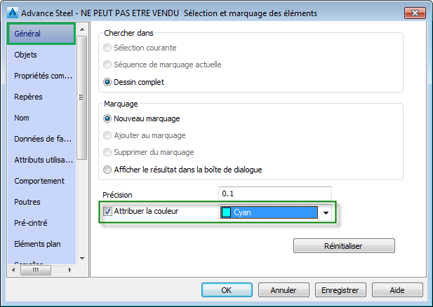 La boîte de dialogue Sélection et marquage des éléments s'affiche. Dans l'onglet Général, cochez la case Attribuer la couleur et, dans le menu déroulant, sélectionnez la couleur de votre choix pour marquer la requête.