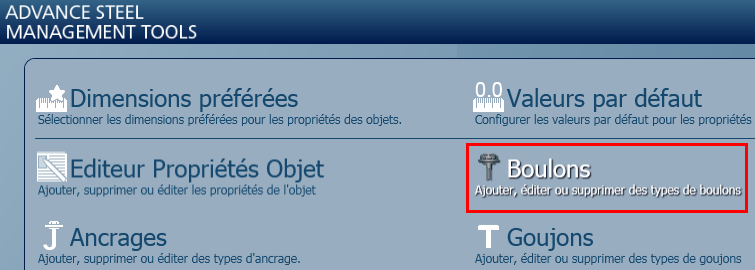 Pour accéder aux paramètres de personnalisation pour les boulons dans Advance Steel :