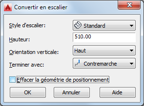 9. Dans la boîte de dialogue Convertir en escalier, vérifiez ou modifiez les valeurs des paramètres Style, Hauteur, Orientation verticale et Terminer avec. Spécifiez un style dans lequel sont définis des limons. Indiquez si vous souhaitez effacer la géométrie, puis cliquez sur OK.