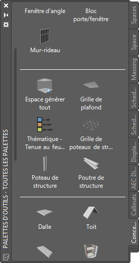 Les palettes personnalisées créées par votre gestionnaire CAO ou d'autres utilisateurs peuvent également contenir des outils de grilles de poteaux de structure, ainsi que des propriétés de grilles de poteaux personnalisées en fonction de vos projets ou de vos normes professionnelles.
