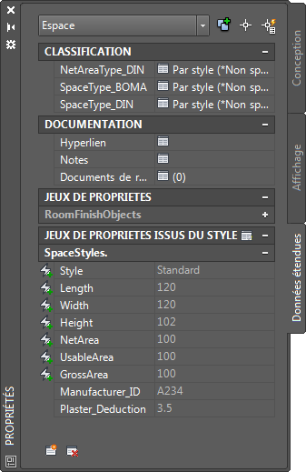 Si des jeux de propriétés spécifiques aux styles et aux objets sont associés à l'objet, ces deux types de jeux sont affichés dans l'onglet Données étendues.