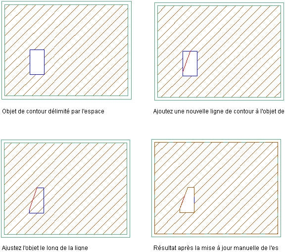 Si vous ajustez un objet de contour en le remplaçant par un nouvel objet de contour en position d'ajustement, le nouvel objet n'est pas automatiquement considéré comme contour de l'espace, car il n'a jamais délimité cet espace auparavant. Pour que le nouvel objet soit reconnu comme tel, vous devez mettre à jour l'espace manuellement. Observez l'exemple suivant :