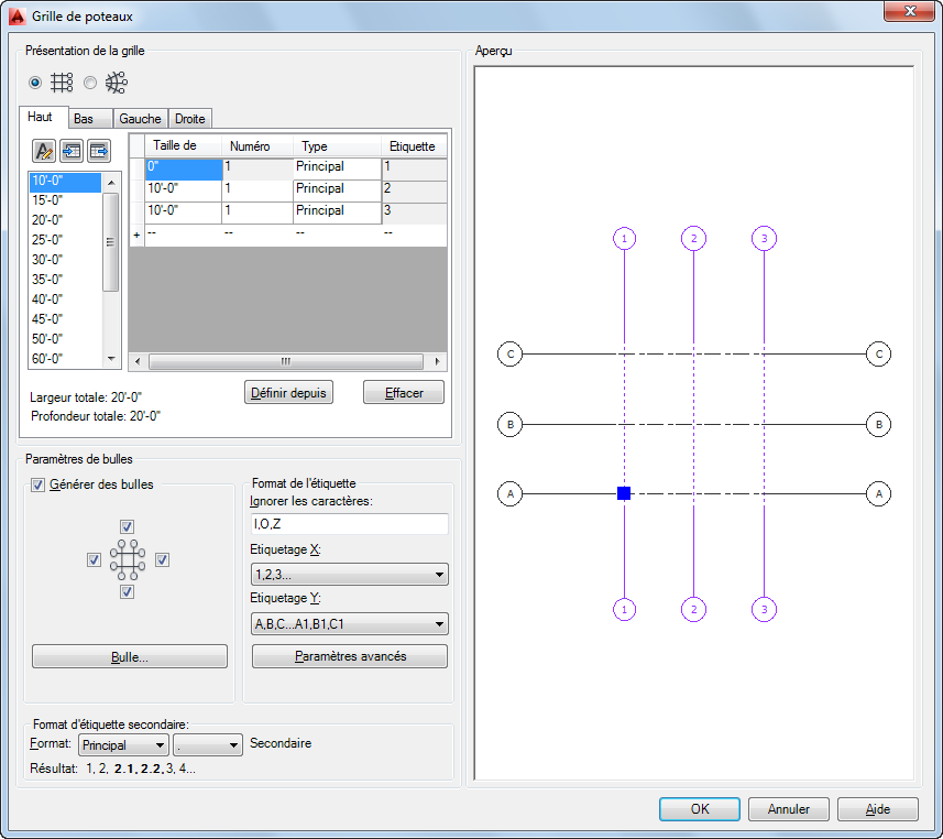 • Les lignes de grille principales ajoutées ensuite ont leur étiquette et leurs valeurs d'étiquette générées en fonction des paramètres de format d'étiquette de la boîte de dialogue Grille de poteaux.