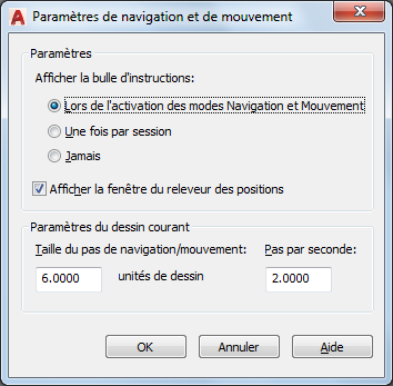 Indique les paramètres de navigation et de mouvement spécifiques au dessin courant.