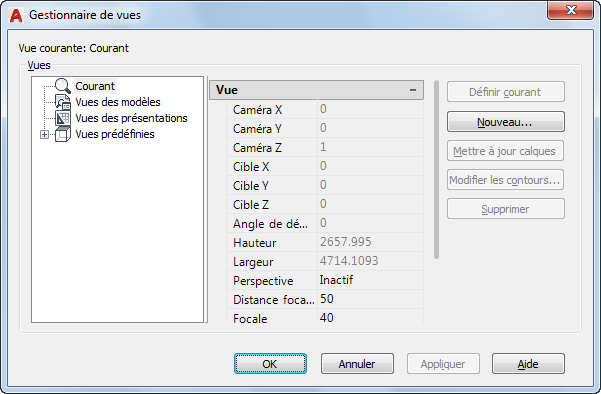 Pour toutes les vues à l'exception des présentations, spécifie la distance focale (en millimètres). En modifiant cette valeur, le paramètre Focale est également modifié.