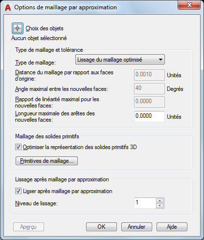 Spécifie les paramètres à utiliser pour la conversion des solides primitifs 3D en objets maillés.