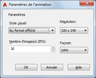 Affiche une liste de formats de sortie d'animation. Les formats AVI, MPG, WMV et MOV sont disponibles.