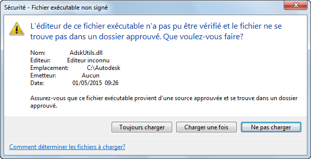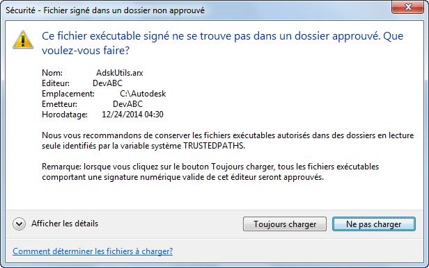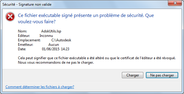 Lorsque vous chargez un fichier programme signé numériquement, le programme AutoCAD en vérifie la signature numérique. Selon que la signature numérique a pu être vérifiée ou non, un message autorisant ou refusant le chargement du fichier dans l'environnement de dessin apparaît.