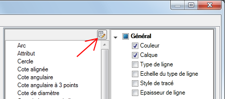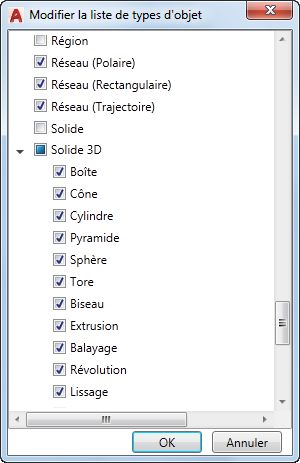 - Dans la boîte de dialogue Modifier la liste de types d'objet, cliquez sur les types d'objet pour lesquels vous voulez afficher des propriétés sur la palette Propriétés rapides.