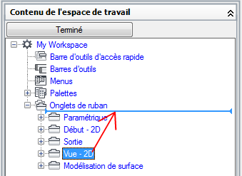 - Dans le volet Contenu de l'espace de travail, cliquez sur le signe plus (+) en regard du nœud Onglets de ruban pour le développer.