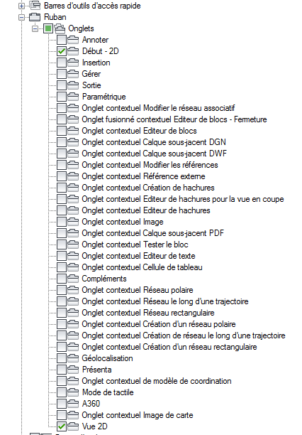 - Sélectionnez la case à cocher située en regard de chaque onglet du ruban que vous souhaitez ajouter à l'espace de travail.