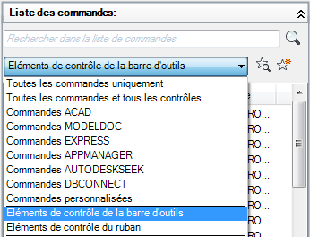 Le volet Liste des commandes affiche uniquement la liste des éléments de contrôle de la barre d'outils.