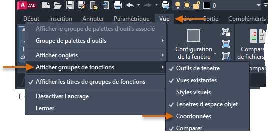 Une coche doit maintenant être placée devant l'onglet Coordonnées dans le menu, et le groupe de fonctions Coordonnées doit à présent s'afficher dans l'onglet Vue.