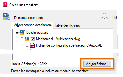 Lorsque vous utilisez eTransmit, la fonctionnalité analyse le dessin courant à le recherche de fichiers référencés, et ceux-ci s'affichent dans la boîte de dialogue Créer un transfert.