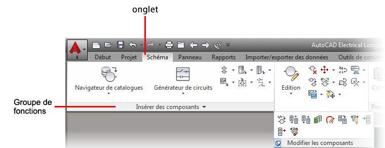 Générateur de circuits, Schéma correspond au nom de l'onglet, Insérer des composants correspond au nom du groupe de fonctions de l'onglet et Générateur de circuits correspond au nom de la commande.