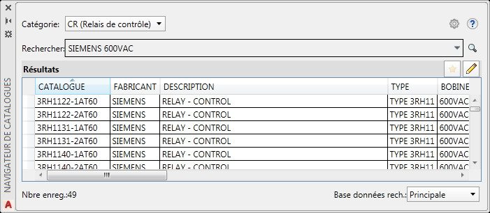 La prochaine fois que le Navigateur de catalogues utilise la table _LISTBOX_DEF pour une bobine de relais, la boîte de dialogue s'ouvre avec la recherche prédéfinie et effectuée.