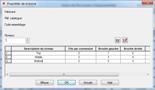 Remarquez dans la boîte de dialogue Insérer / Modifier le symbole de borne, section Propriétés/Associations, que le bloc a désormais trois niveaux. La borne 4 est affectée au niveau supérieur du bloc.