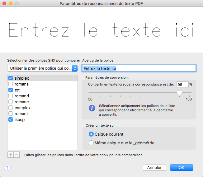 • Utiliser la meilleure correspondance de police. Lorsque cette option est activée, toutes les polices sélectionnées sont comparées et, plutôt que la première correspondance dépassant le pourcentage de conversion défini, c'est celle qui correspond le mieux qui est utilisée.