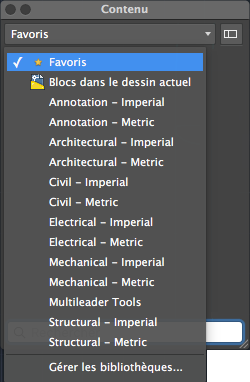 Affiche les bibliothèques disponibles. Sélectionnez une bibliothèque à partir de laquelle insérer des blocs ou sélectionnez Gérer les bibliothèques pour afficher la boîte de dialogue Gérer les bibliothèques de contenu. Les bibliothèques suivantes sont disponibles par défaut :