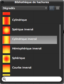 La bibliothèque de hachures peut être affichée sous forme de boîte de dialogue lors de l'utilisation de la boîte de dialogue Hachures et gradient, ou en tant que palette à partir du viseur Hachures ou Gradient.