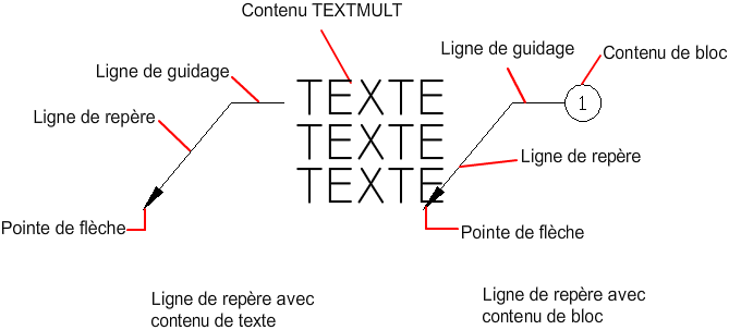 Un objet de ligne de repère est une ligne ou une spline dont une extrémité comporte une pointe de flèche et l'autre extrémité un objet ou bloc de texte multiligne.