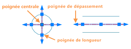 Les poignées permettent la manipulation directe des marques de centre et des traits d'axe. Dans cet exemple, les traits d'axe sur le cercle sont modifiés individuellement. Lorsque vous faites glisser la poignée de longueur, le programme ajuste la longueur du trait d'axe et l'extension du trait d'axe se déplace avec lui. Mais si vous faites glisser la poignée de dépassement, le programme contrôle uniquement l'extension du trait d'axe.