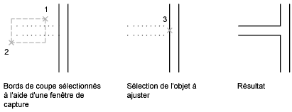 Il n'est pas nécessaire que les objets sélectionnés, tels que les arêtes sécantes ou les contours, présentent une intersection avec l'objet ajusté. Vous pouvez ajuster ou étendre un objet vers un bord projeté ou vers une intersection extrapolée, c'est-à-dire à l'endroit où il y aurait intersection entre les objets s'ils étaient étendus.