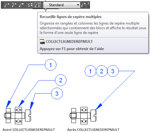 Les objets de ligne de repère multiple contenant des blocs en tant que contenu peuvent être collectés et attachés à une ligne de guidage. Avec COLLECTLIGNEDEREPMULT, les lignes de repère multiples peuvent être collectées horizontalement, verticalement ou dans une zone spécifiée en fonction des besoins de votre dessin.