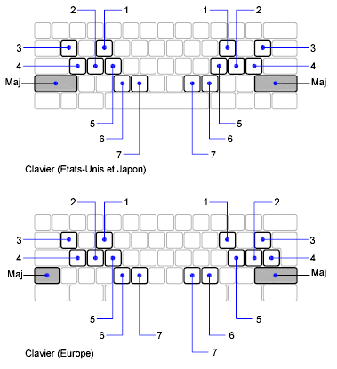 Maintenez la touche Maj enfoncée ainsi qu'une des touches de remplacement temporaire de l'illustration : |