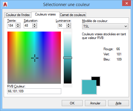Spécifie le modèle de couleurs RVB pour la sélection des couleurs. Les options disponibles dans l'onglet Couleurs vraies dépendent du modèle de couleurs indiqué : TSL ou RVB.