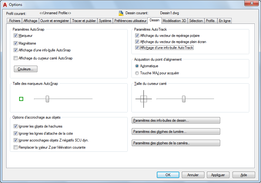 Gère l'affichage du marqueur AutoSnap. Le marqueur est un symbole géométrique qui s'affiche lorsque le réticule est placé sur un point d'accrochage (variable système AUTOSNAP).